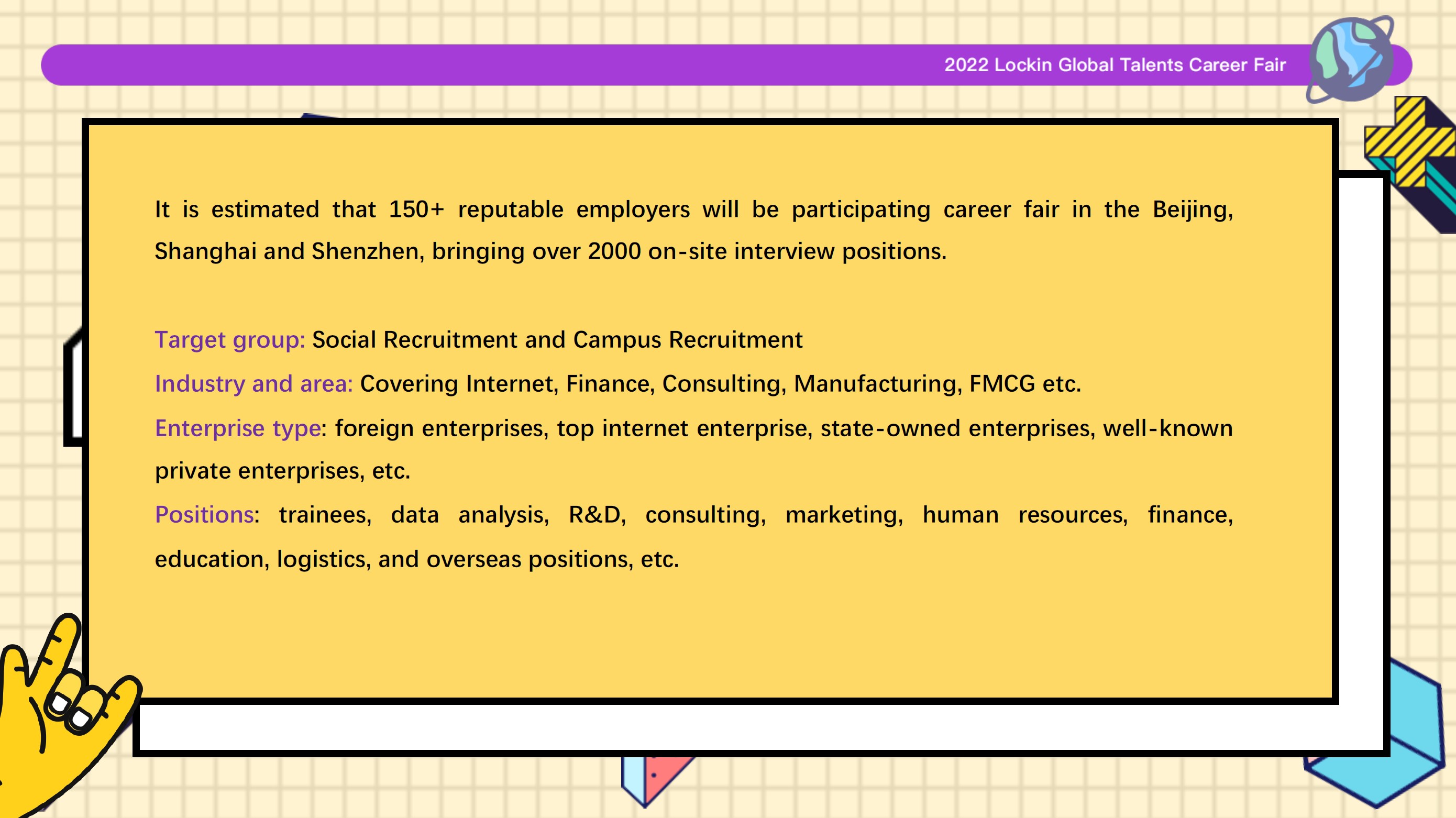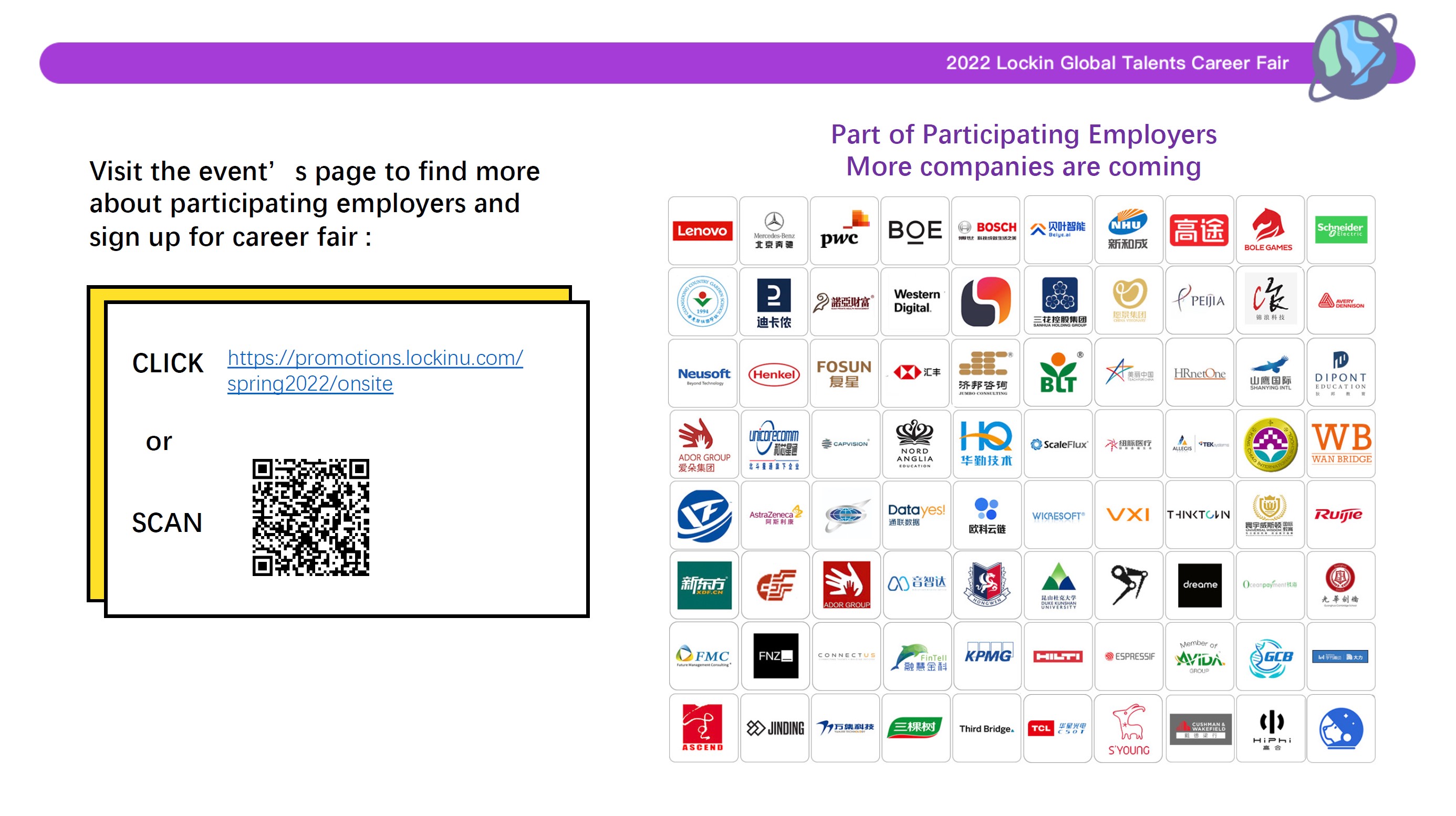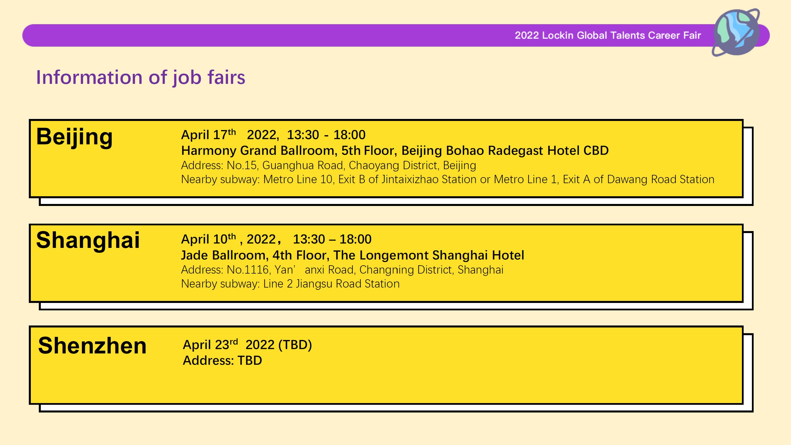 Due to the sudden outbreak of the epidemic in several major cities in China, we have to postpone our job fairs in Beijing, Shanghai and Shenzhen. The new job fairs are as follows: